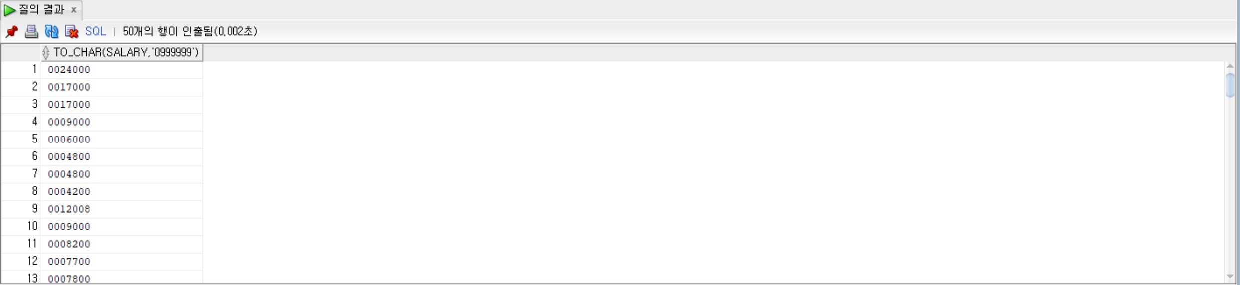 SELECT TO_CHAR(salary, '0999999') FROM employees;