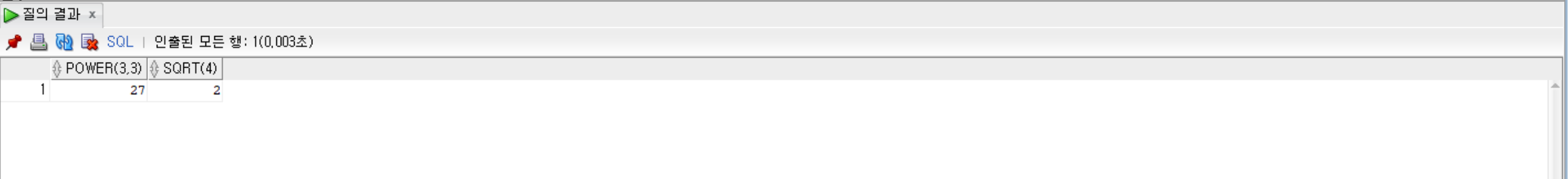 • 거듭제곱을 출력하는 POWER() 함수, 제곱근을 출력하는 SQRT() 함수