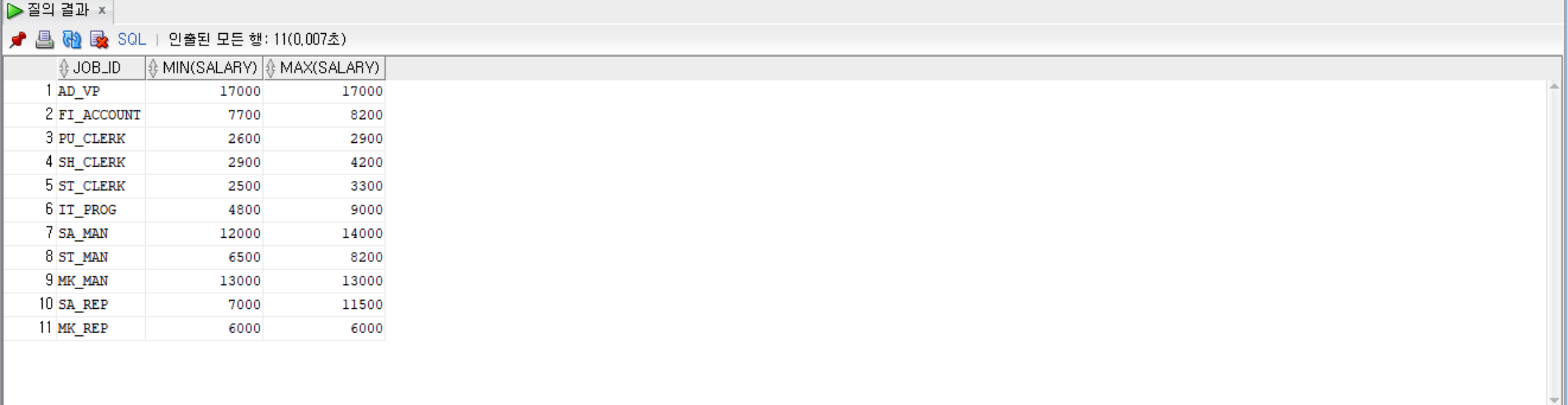 --그룹화한 뒤에 job_id와 salary 최솟값과 최대값을 조회