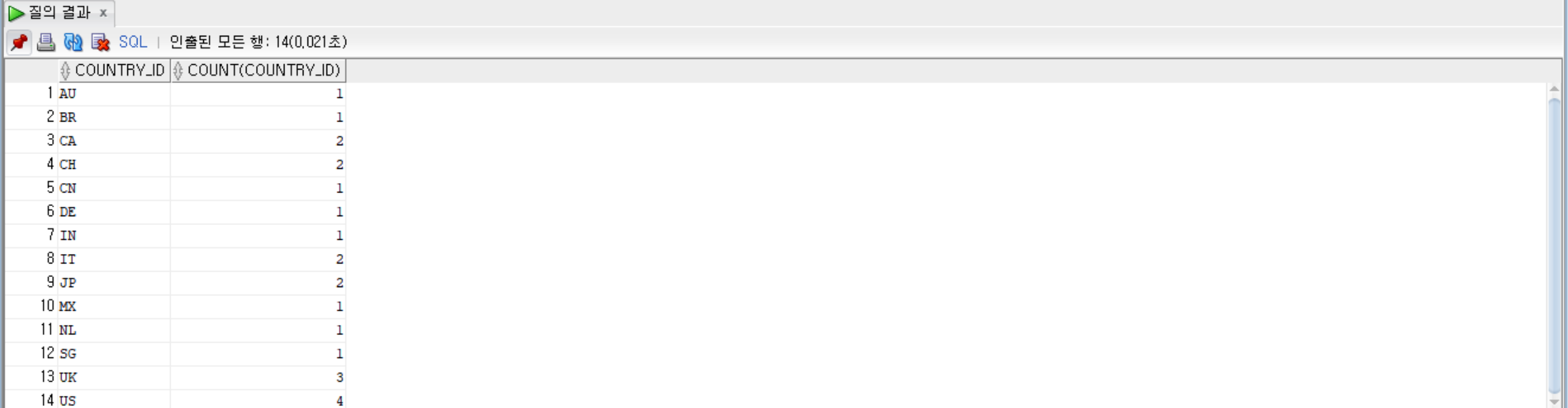 --country_id로 묶고, country_id순으로 정렬하고, 그룹별로 country_id와 country_id컬럼의 열의 개수를 출력