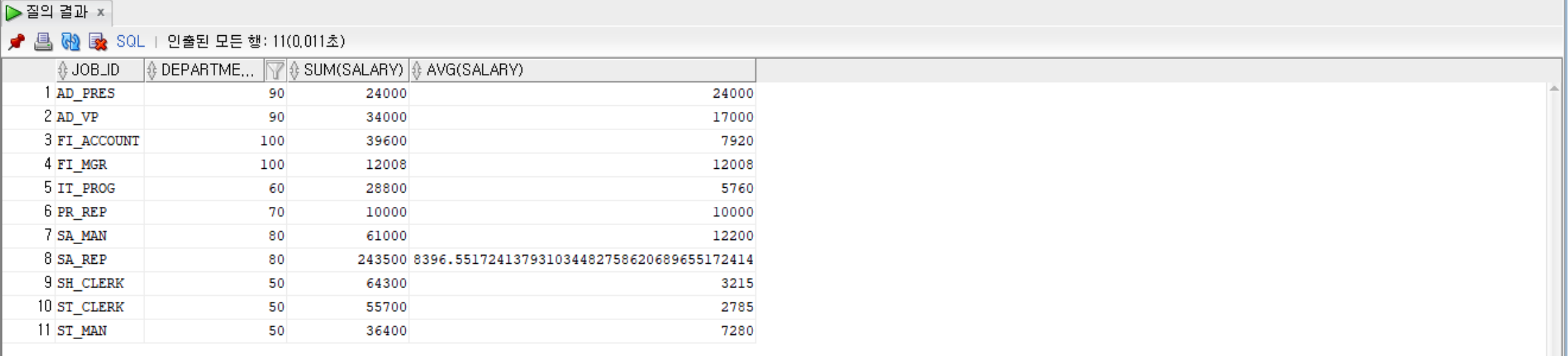 SELECT job_id, SUM(salary), AVG(salary)