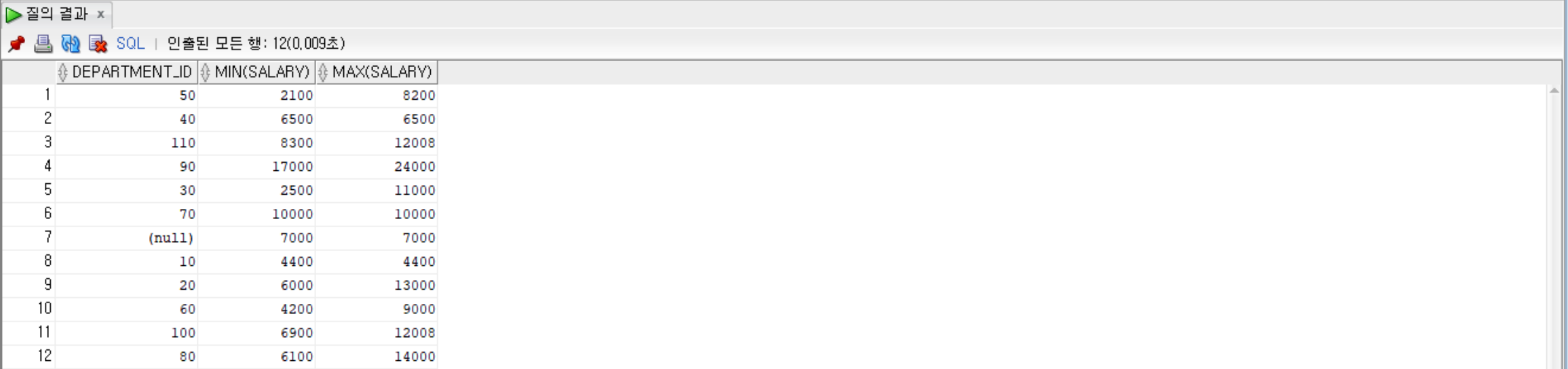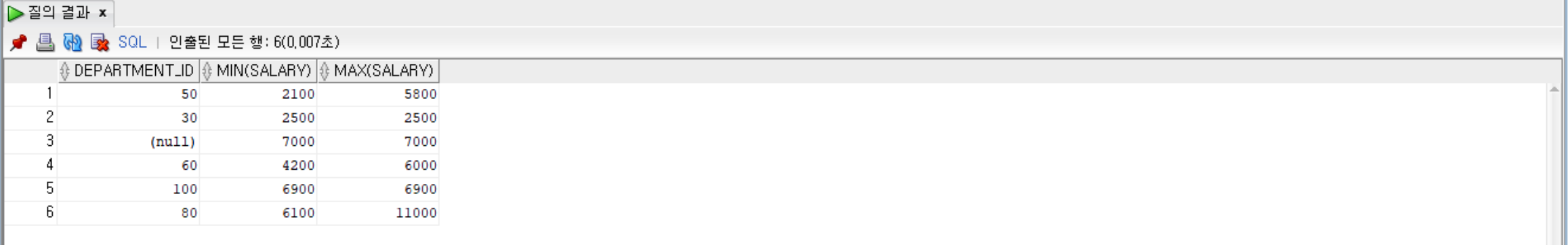 --department_id로 묶고, salary의 최댓값이 7000초과인 것만, 그룹별로 department_id, salary의 최솟값, 최댓값 출력