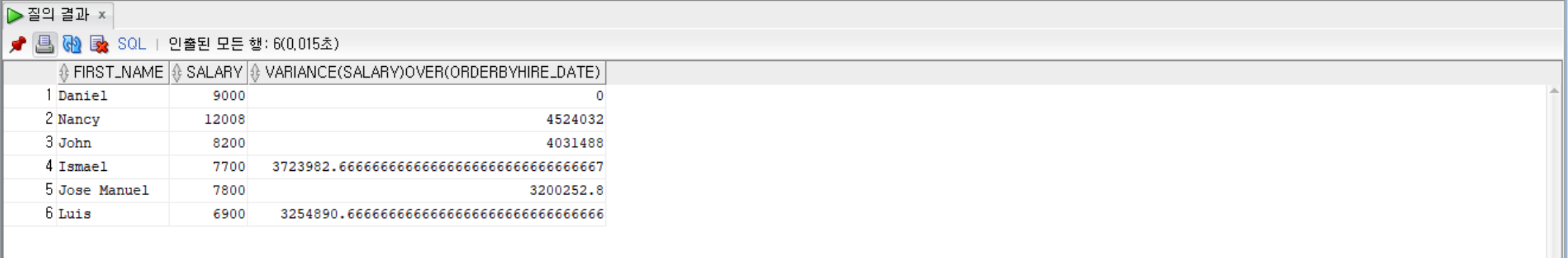 SELECT first_name, salary, VARIANCE(salary) OVER (ORDER BY hire_date)