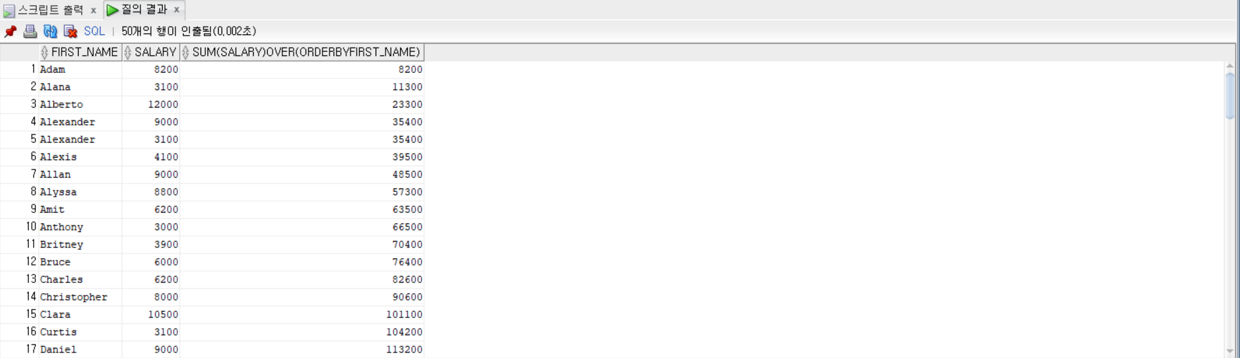 -- salary 값을 first_name의 순서대로 더하는 것으로, 각 행에서 이전 행까지의 모든 값을 누적하여 합산