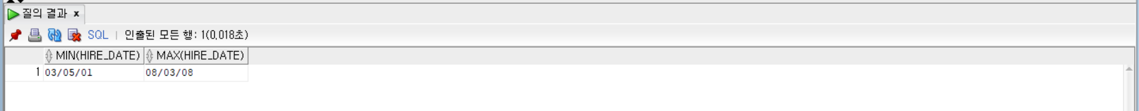--employees 테이블에서 department_id가 50인 데이터의 hire_date 최소값과 최댓값 조회