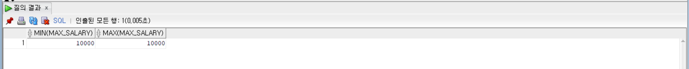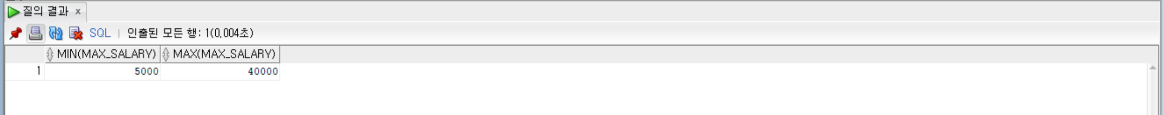 --jobs 테이블에서 max_salary 값의 최솟값과 max_salary 값의 최댓값을 조회