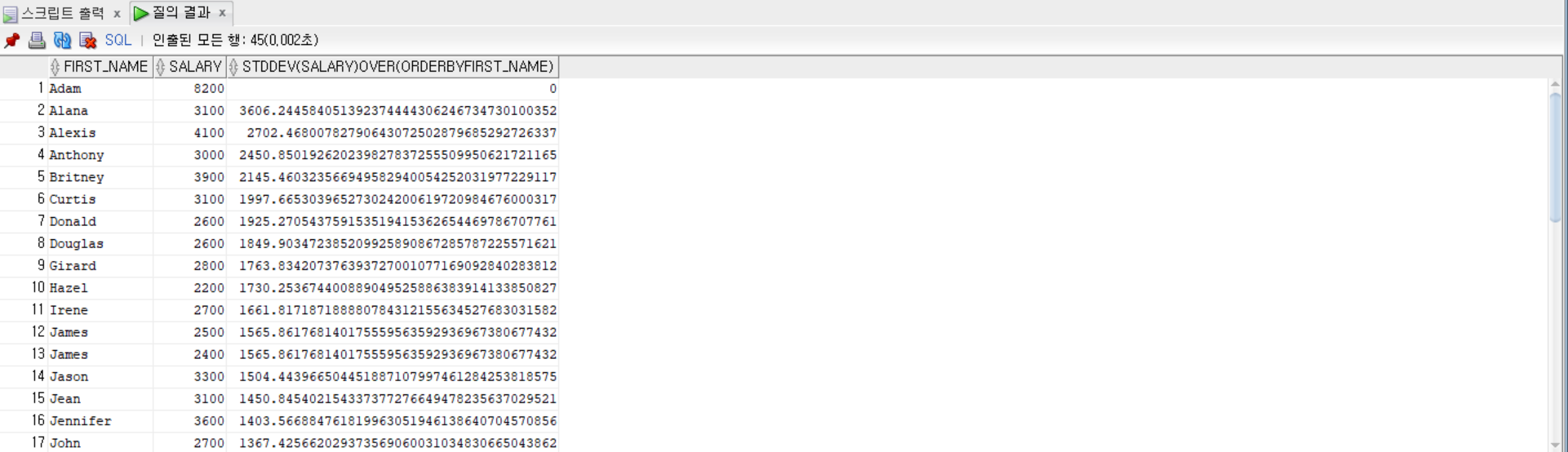 STDDEV(salary) OVER (ORDER BY first_name)