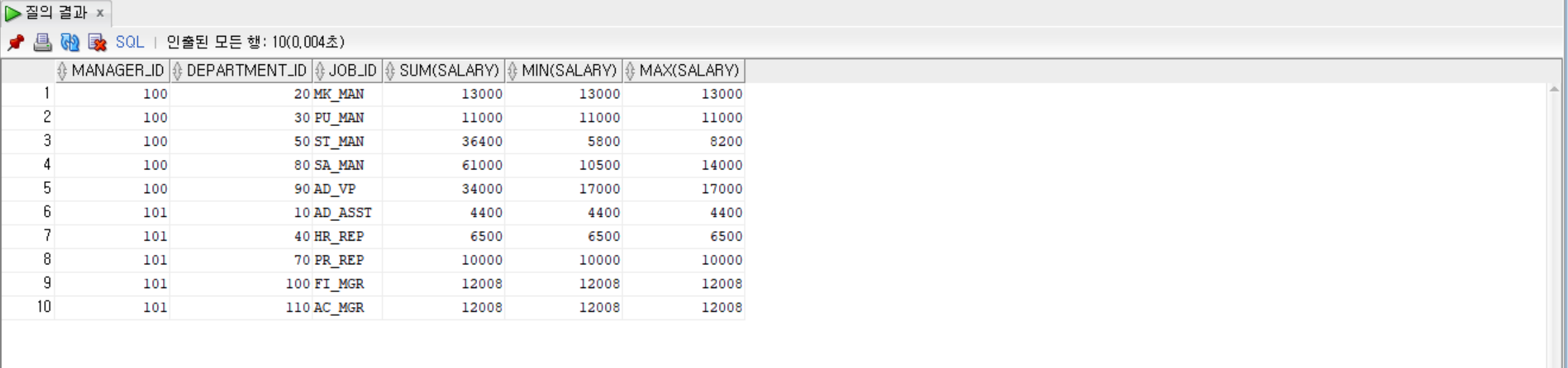 SELECT manager_id, department_id, job_id, SUM(salary), MIN(salary), MAX(salary)