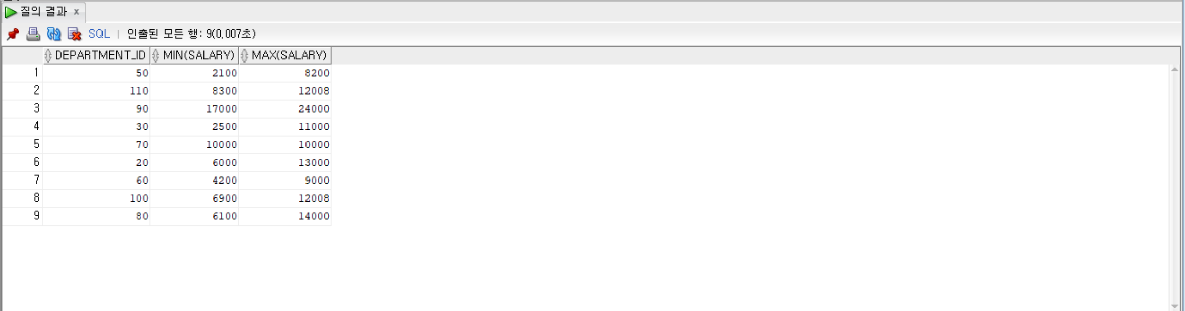 --department_id로 묶고, salary의 최댓값이 7000초과인 것만, 그룹별로 department_id, salary의 최솟값, 최댓값 출력