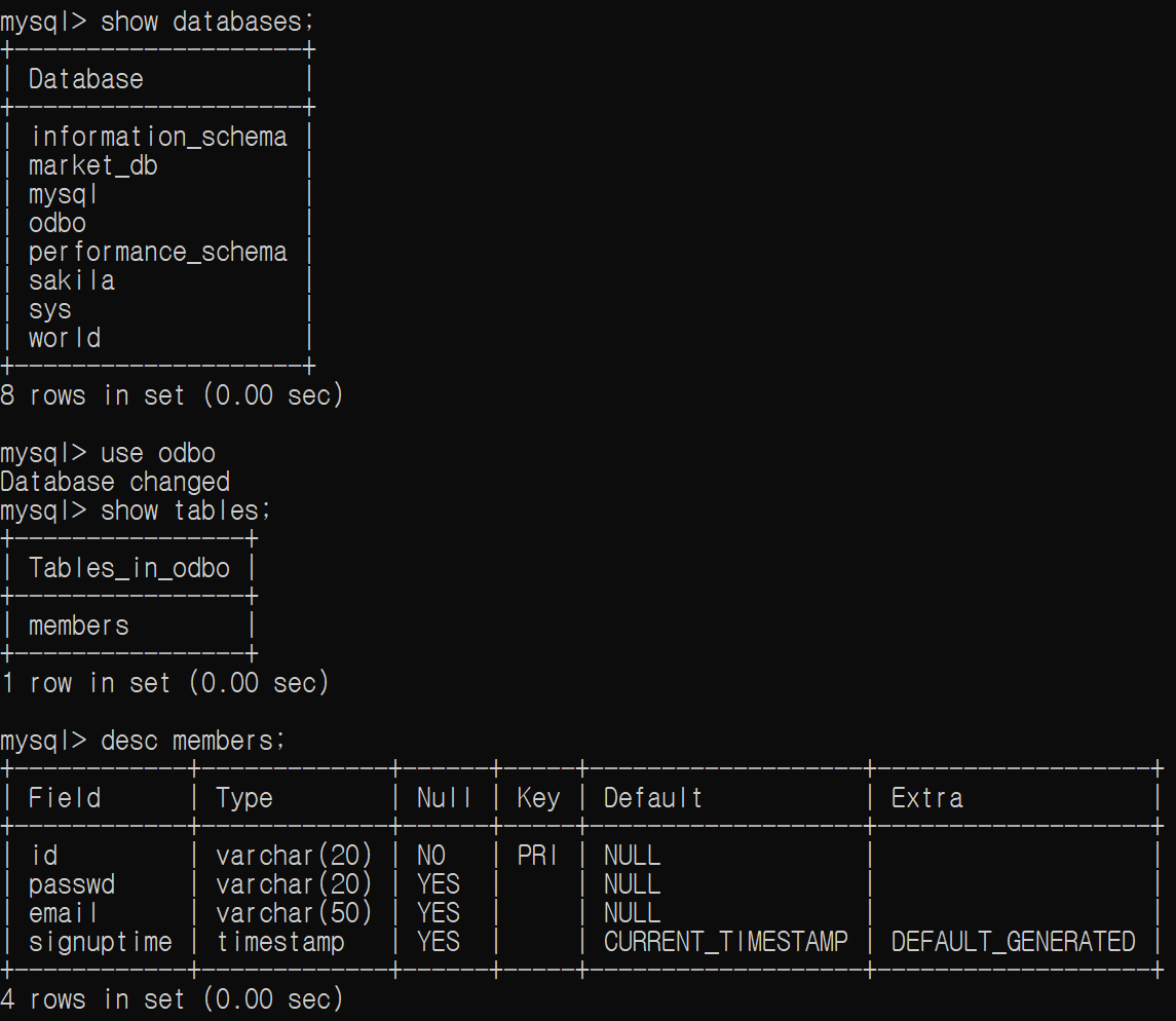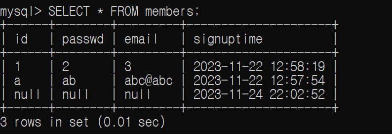 //INSERT INTO members(id, passwd, email) VALUES( 'idData', 'passwdData', 'emailData' )