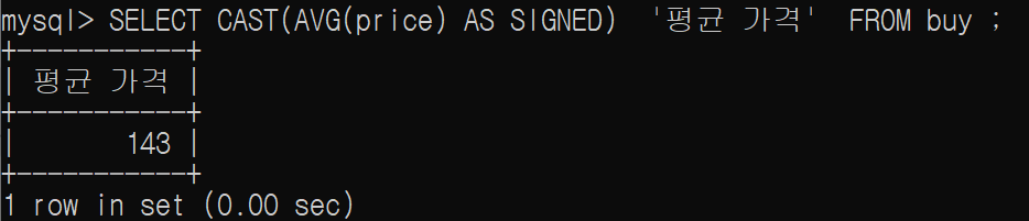 SELECT CAST(AVG(price) AS SIGNED) '평균 가격' FROM buy ;