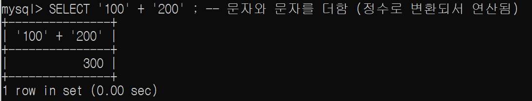 SELECT '100' + '200' ; -- 문자와 문자를 더함 (정수로 변환되서 연산됨)