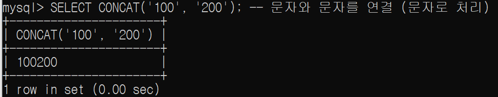 SELECT CONCAT('100', '200'); -- 문자와 문자를 연결 (문자로 처리)