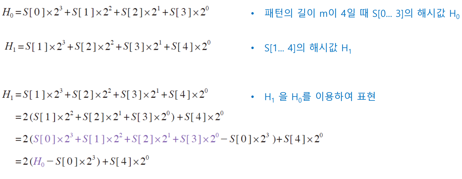 else strHash = 2 * (strHash - (str.charAt(i - 1) * power)) + str.charAt(patternLen - 1 + i); //기존 해시코드에서 맨 앞 문자의 해시코드는 버리고, 추가되는 문자의 해시코드는 더한다.