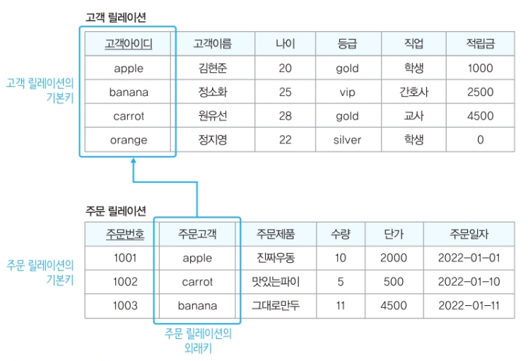외래키는 다른 릴레이션의 기본키를 참조하는 속성이고 릴레이션 간의 관계를 표현하는 역할을 한다.