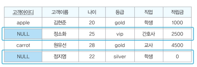 널 값은 특정 속성에 해당되는 값이 없음을 나타내므로 숫자 0이나 공백 문자와는 다르다.