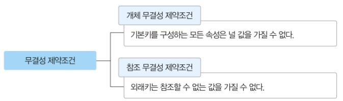 즉, 기본키는 널 값을 허용하지 않으므로 새로운 레코드가 추가될 때 기본키 속성에는 반드시 유효한 값이 포함되어야 한다.