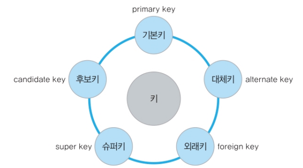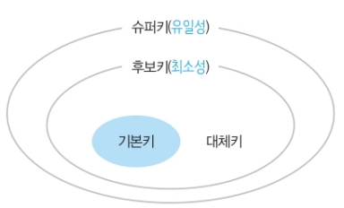 관계 데이터 모델에서는 키를 아래와 같이 슈퍼키, 후보키, 기본키, 대체키, 외래키의 다섯 가지로 분류할 수 있다.