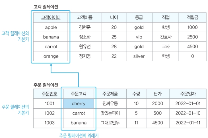 외래키는 다른 릴레이션의 기본키를 참조하는 속성이고 릴레이션 간의 관계를 표현하는 역할을 한다.