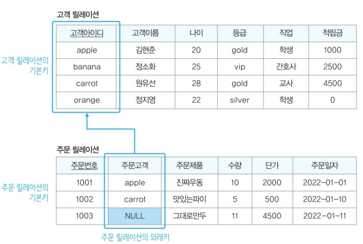 위 그림에서 주문고객 속성 값이 널이라는 것은 주문한 고객이 누구인지 모를 뿐, 고객 릴레이션에 존재하지 않는 고객이 주문한 것으로 판단하기는 어렵기 때문이다.