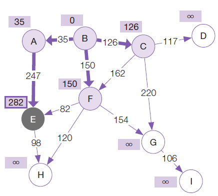 A의 경로 길이 35와 간선 A-E의 비용 247을 더한 값 282를 경로 길이로 입력