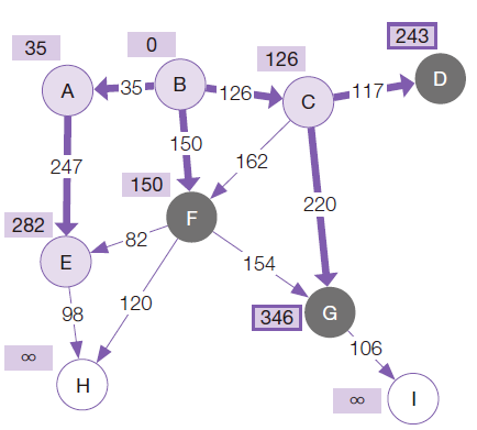 G도 마찬가지로 기존 B-C-G(비용 346)보다 새 경로 B-F-G(비용 304)가 저렴하므로 예전 것을 폐기하고 새 경로를 채택