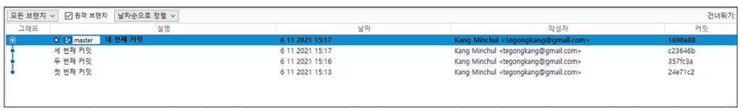 위 캡쳐 화면에서 맨 오른쪽에 있는 커밋 항목은 해시 값의 앞부분만 따놓은 것이다.