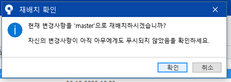 master 브랜치에 병합할 브랜치의 커밋을 클릭한 뒤 확인을 누르면 해당 커밋이 병합된다.