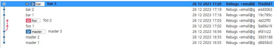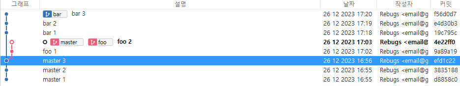 foo는 master 브랜치의 세 번째 커밋에서 뻗어 나온 브랜치이기 때문에 master 브랜치의 커밋 세 개를 모두 포함하고 있기 때문이다.