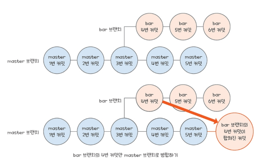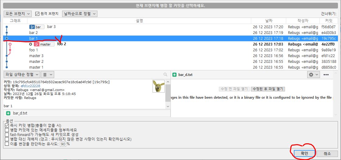 위 그림처럼 bar 브랜치의 4번 커밋을 master 브랜치로 병합하려면 4번 커밋을 클릭한 뒤 확인을 클릭하면 된다.