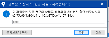 스테이지에 올라가지 않은 파일 항목에 있는 a.txt 파일에서 충돌 해결을 클릭하면 '내 것'을 이용해 해결 항목과 '저장소'것을 사용하여 해결 항목이 있다.