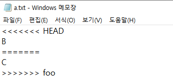 master 브랜치는 a.txt 파일의 첫 번째 줄을 B로 수정한 다음 커밋했고, foo 브랜치는 a.txt 파일의 첫 번째 줄을 C로 수정한 다음 커밋했다.