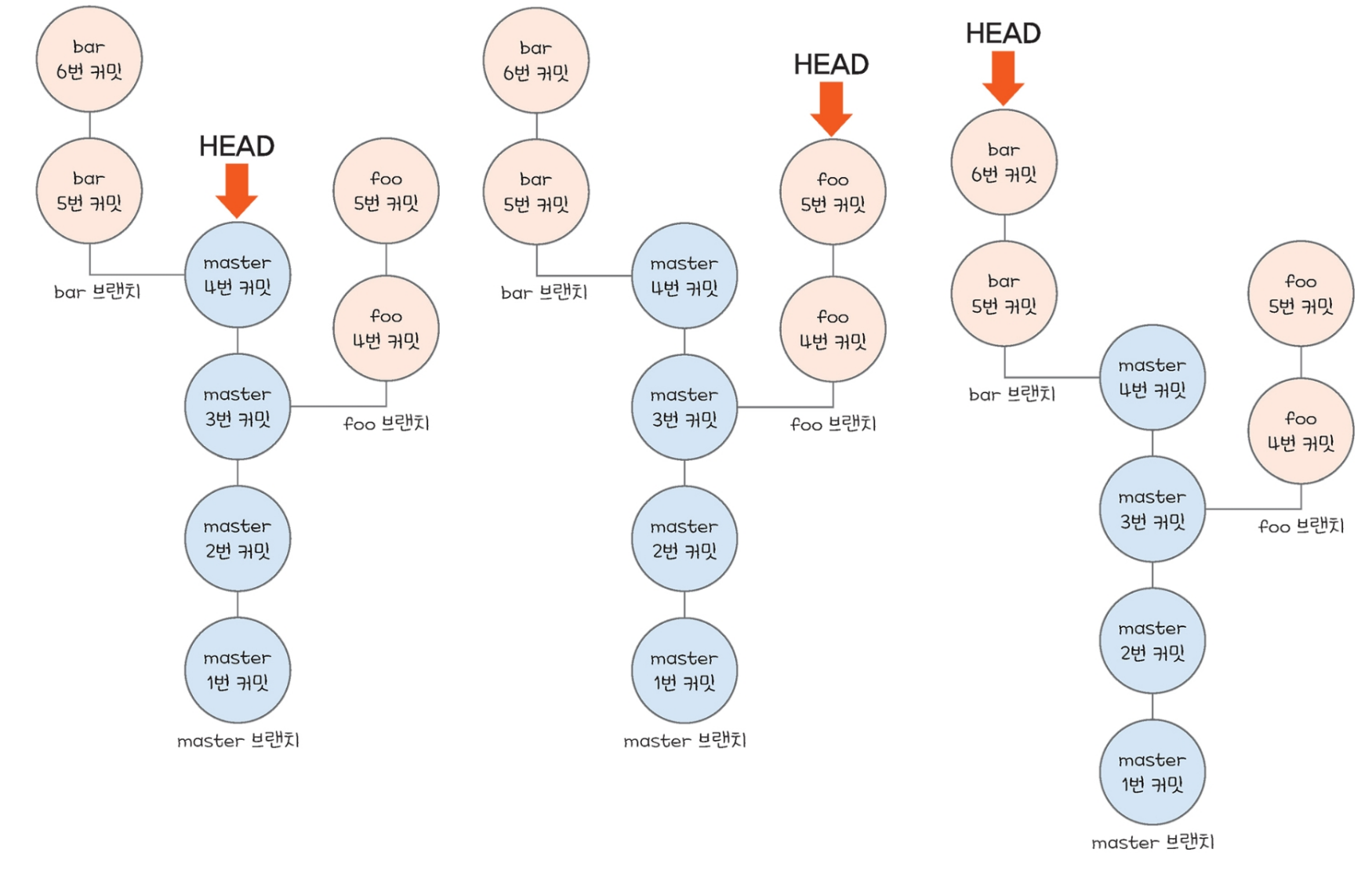 위에서 언급했듯이 이 상황에서 foo 브랜치가 아니라 master 브랜치로 체크아웃하면 HEAD는 master 3번 커밋을 가리키게 되고, 작업 디렉터리의 파일들도 master 3번 커밋으로 되돌아가게 된다.