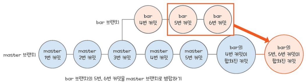즉, bar 브랜치가 master 브랜치에서부터 뻗어 나온 시점부터 병합되는 순간까지 master 브랜치에 어떤 변화가 있을 때 병합하는 것을 뜻한다.