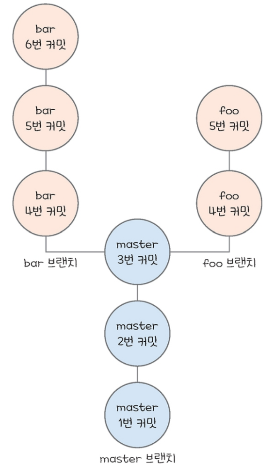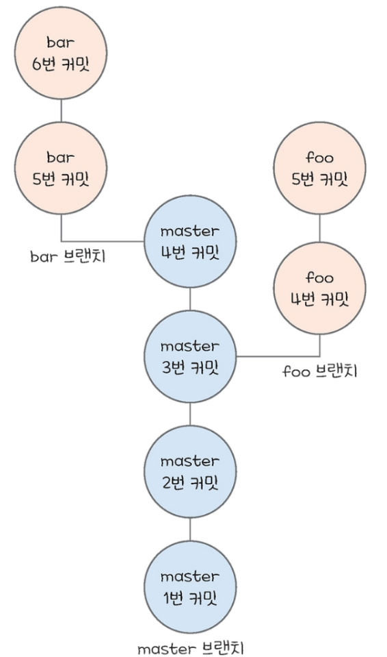 여기서 master의 4번 커밋에서 bar라는 브랜치를 나누고, bar에 두 개의 커밋을 추가하면 아래의 그림과 같다.
