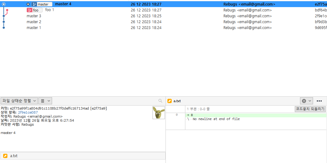 이런 상황에서 foo 브랜치를 master 브랜치에 병합한다면 a.txt 에서 충돌이 발생했다고 한다.