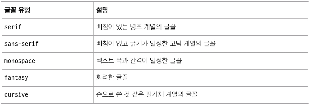 이러한 특징 때문에 font-family 속성으로 명시한 글꼴을 불러오지 못할 경우를 대비해 불러오려고 한 글꼴과 가장 유사한 형태의 글꼴 유형을 마지막에 항상 지정해야 한다.