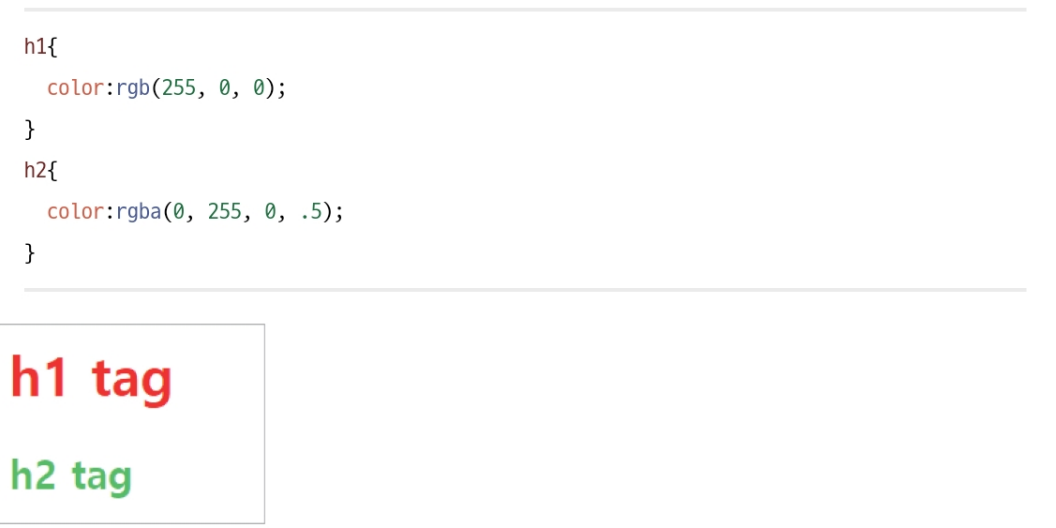 rgb나 rgba 형식은 RGB 값을 256개 숫자(0~255)로 표기한다.