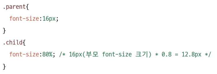 만약 다음과 같이 자식 요소의 font-size 속성값을 80%라고 지정했다면 자식 요소는 부모 요소 font-size 속성값의 80%에 해당하는 크기로 설정된다.