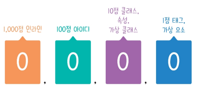 개별성 규칙 점수사용된 선택자 종류를 파악해 점수를 계산하는 방식인데, 아래 그림처럼 선택자를 분류해서 개수를 세고 점수를 곱해 합을 구하면 된다. 추가적으로 !important라는 특별한 문법이 있다. 이 문법의 점수는 10,000점이다.