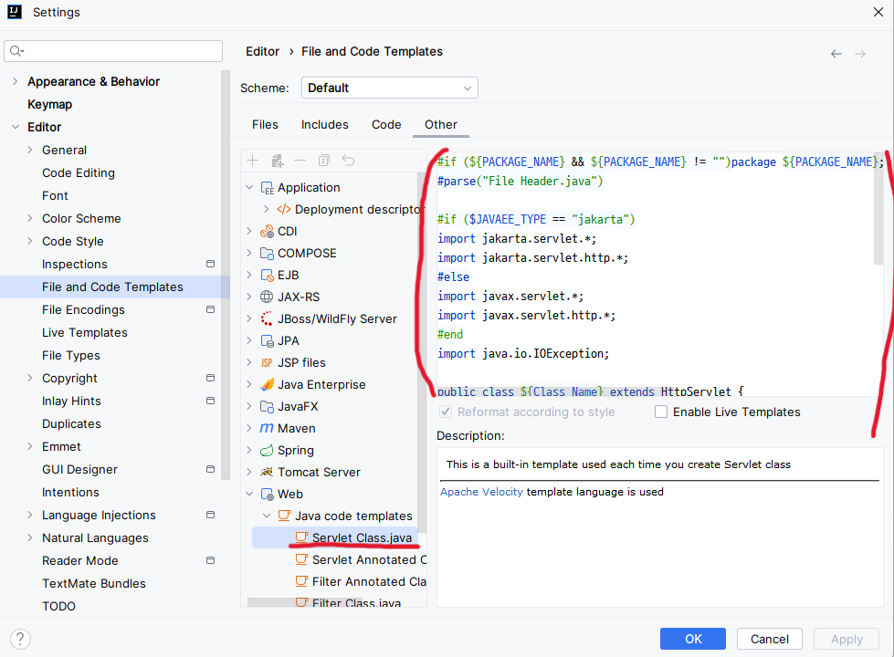 Web - Java code templates - Servlet Class.java를 누르면