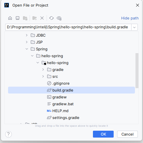 아까 다운로드 받은 파일의 경로로 들어가서 build.gradle 파일을 선택하고 ok 버튼을 누른다.