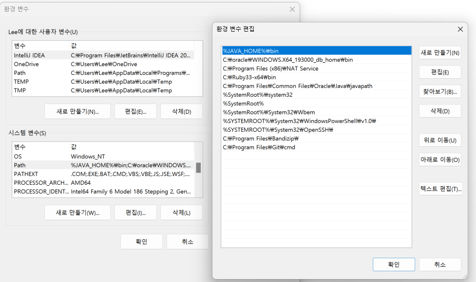 - 시스템 변수 - Path - 편집 버튼을 눌러서 환경 변수 편집 창을 띄운다.