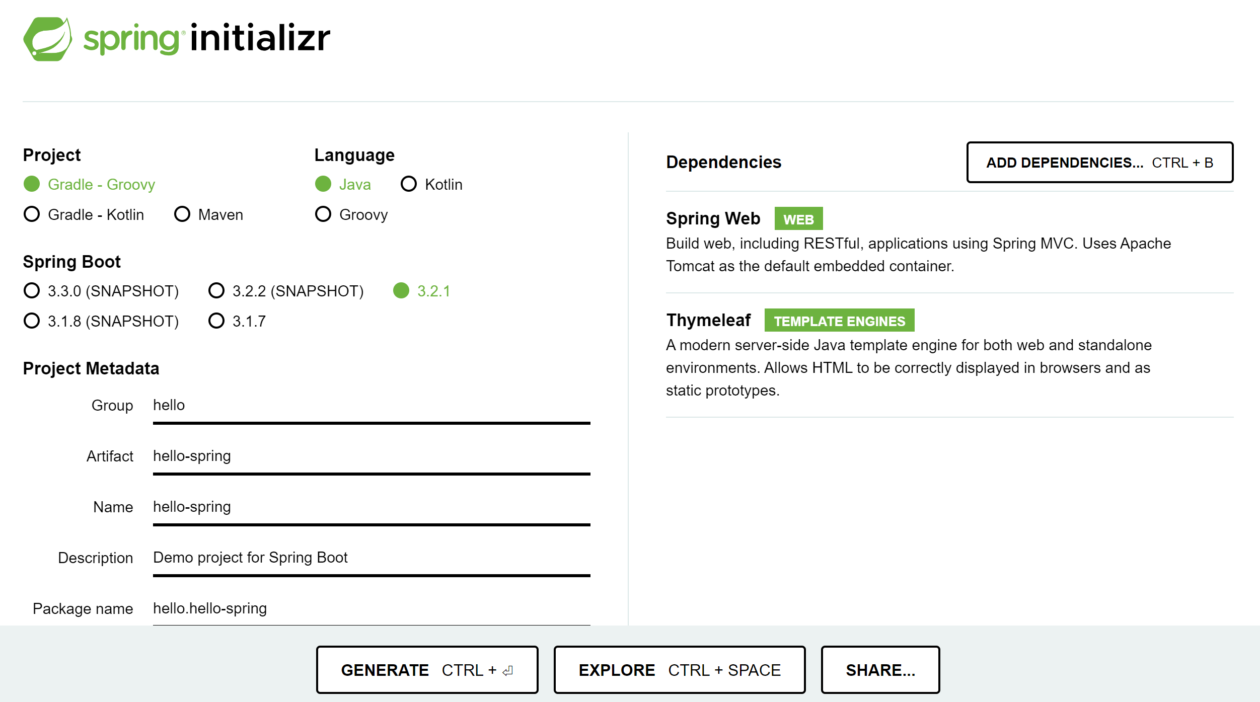 Dependencies에 Spring Web과 Thymeleaf를 추가해준다.