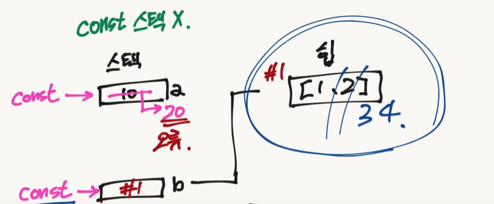 따라서 const로 선언되었더라도 스택 영역에 있는 힙 영역 주소가 바뀌지 않는 한, 힙 영역에 있는 배열이 변경되어도 된다.