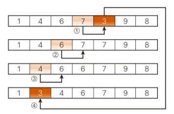 현재 위치의 원소가 더 작은 원소를 만날 때까지 계속하여 비교하며, 자신이 들어갈 위치를 찾는다.