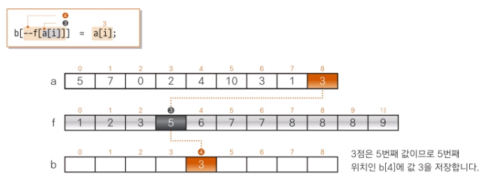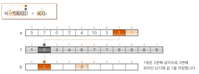 남은 작업은 배열 a의 각 요솟값과 f를 대조하여 정렬을 마친 배열을 마친 배열을 만드는 일이다.