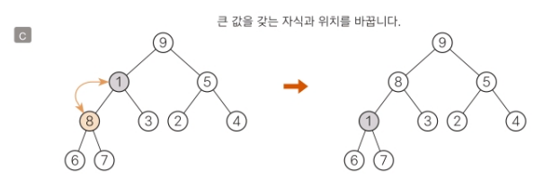 그러나 왼쪽 자식 8을 루트로 하는 부분트리(b)와 오른쪽 자식 5를 루트로 하는 부분트리(c)는 모두 힙이다.