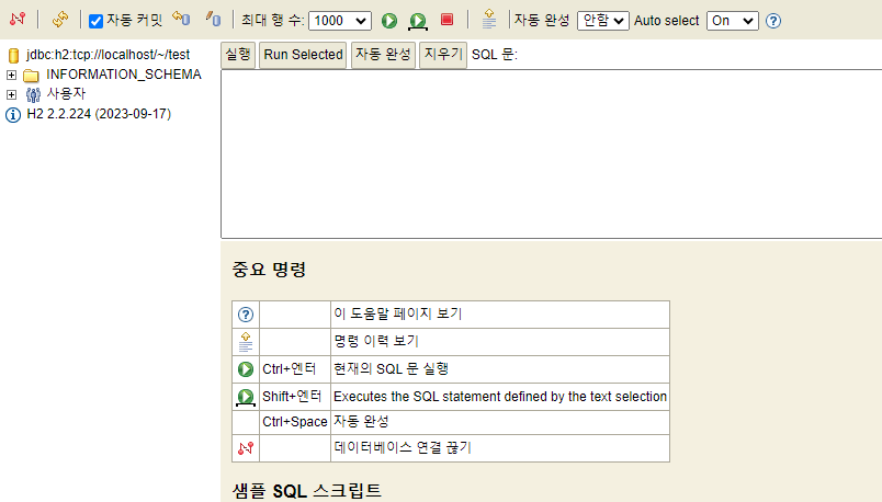 아래와같이 H2 Database에 연결이되며, 좌측 상단에 연결끊기 라는 툴팁이 뜨는 버튼을 클릭하면 접속이 종료되고 초기 페이지가 출력된다.