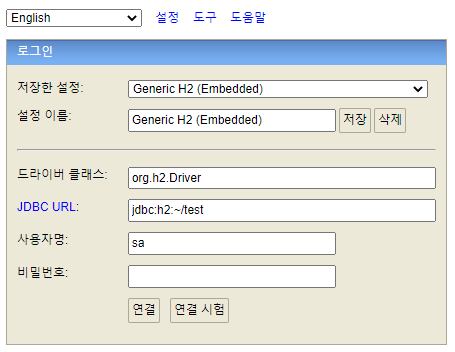 JDBC URL : jdbc:h2:~/test (최초 한번 입력)를 입력한다.